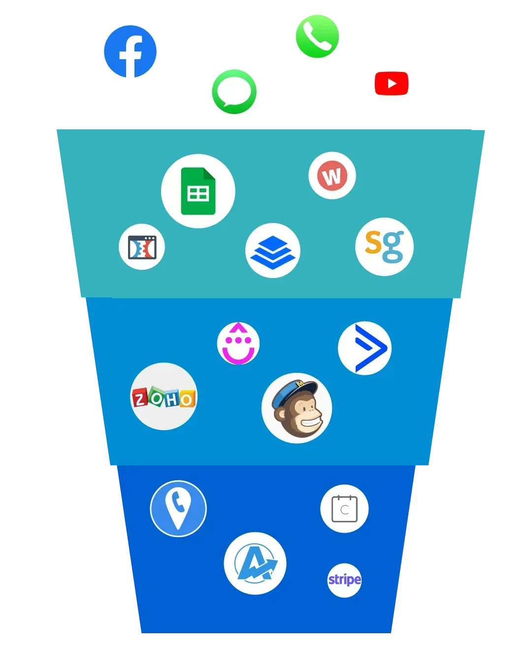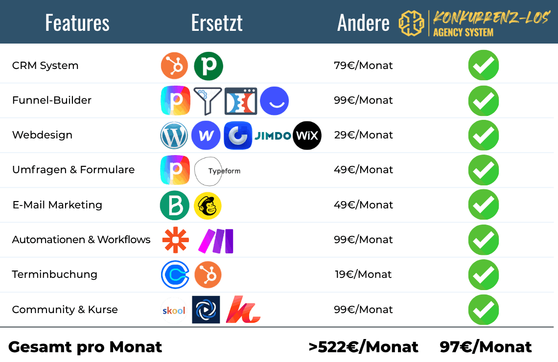 Ersetze mehrere Einzellösungen durch ein System, das CRM, Funnels, Webseiten, Kalender, E-Mail-Marketing und vieles mehr bereits mitbringt.